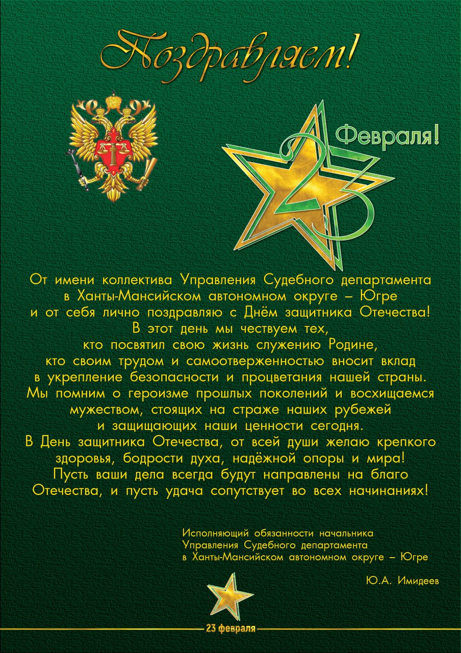 | Управление Судебного департамента в ХМАО - Югре поздравляет с 23 февраля! | версия для печати |